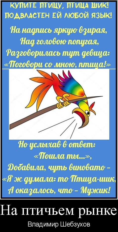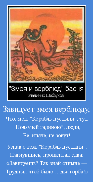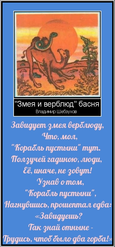 Уж точно, в баснях Шебзухова, Найдётся оная мораль. Но ради случая такого И повторить её не жаль — Всё лучше — недоговорить, Чем, сдуру — переговорить!